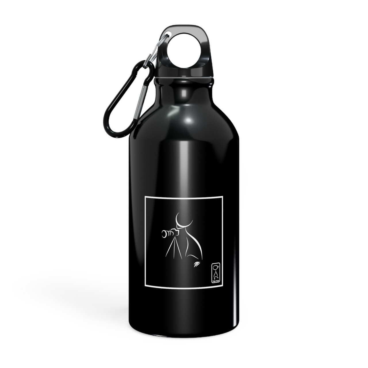 Stiilne 400ml spordipudel karabiiniga, mida kaunistab joonistus Tuju Kujust.